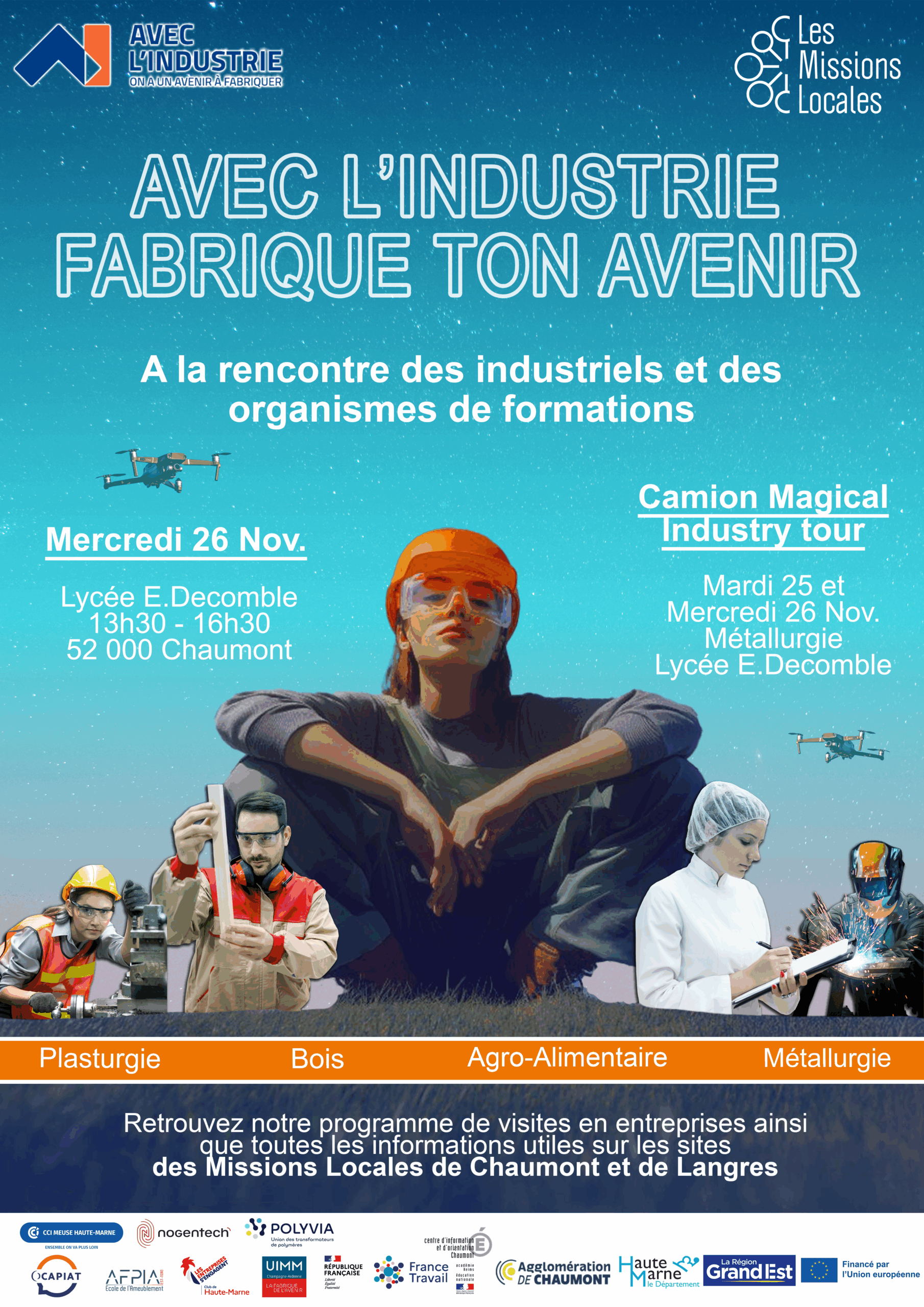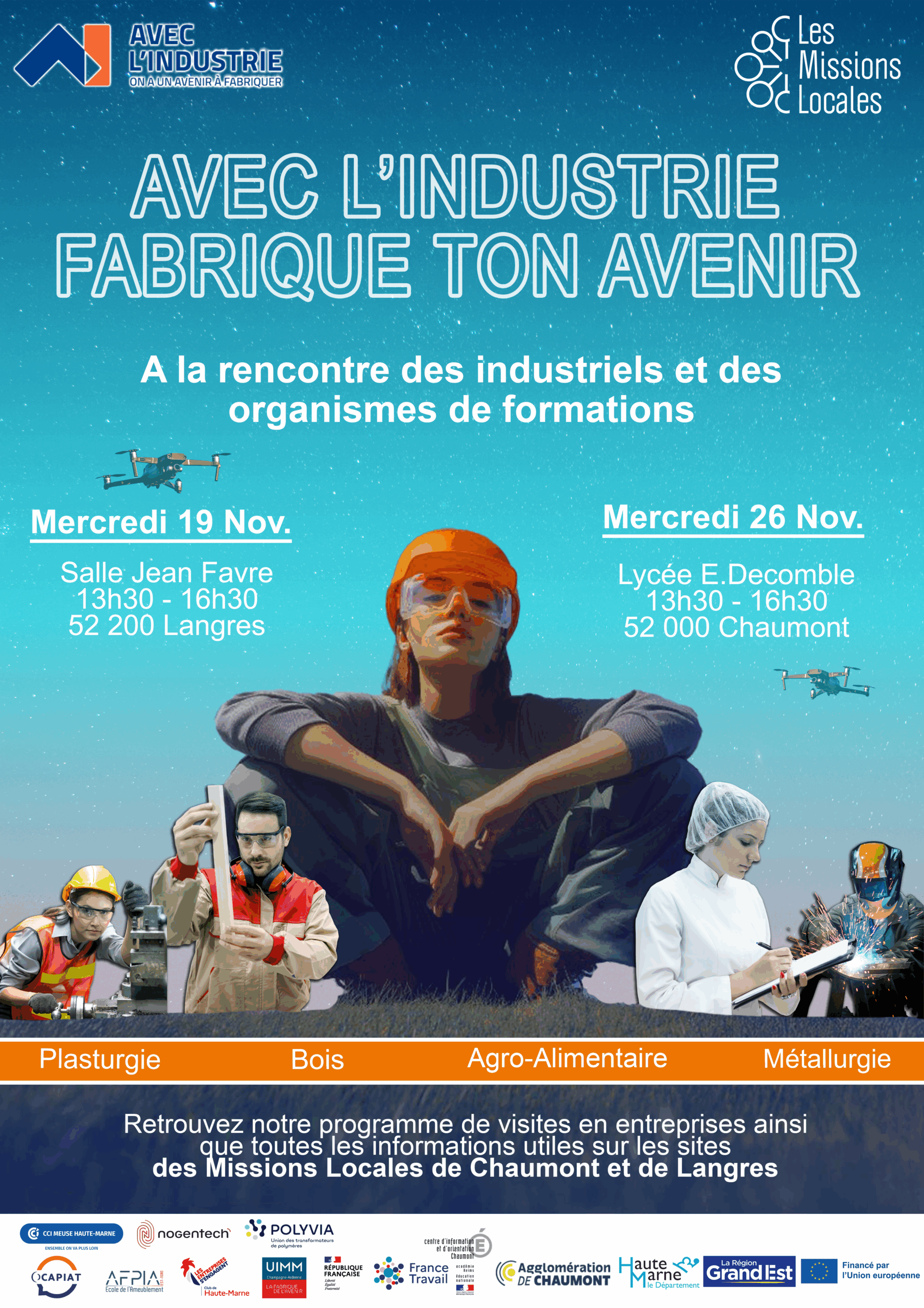 L’Espace métiers a pour objectif de faire découvrir et promouvoir les métiers du territoire Chaumontais. Par le biais, de forums, des jobs dating, et des réunions d’information, nous vous proposons des événements tout au long de l’année.